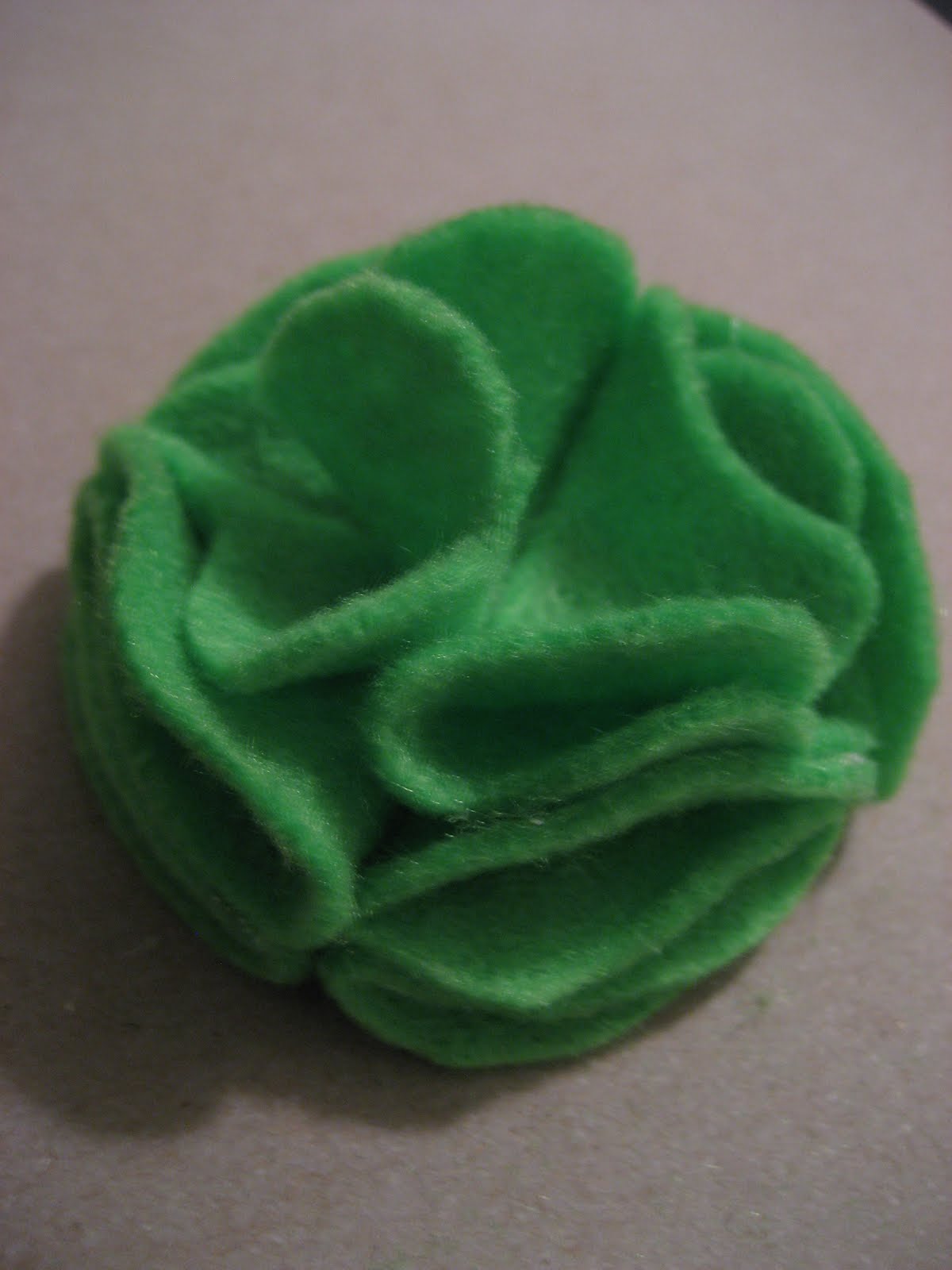 Next I cut 2 "wavy" circles out of felt just a smidgen smaller than the 4 circles were (how do you like that for a measurement?!) so that when they're glued down on top of the 4 triangles they look a little more flower like. These circles you only fold in half once and glue down on top of your folded triangles.